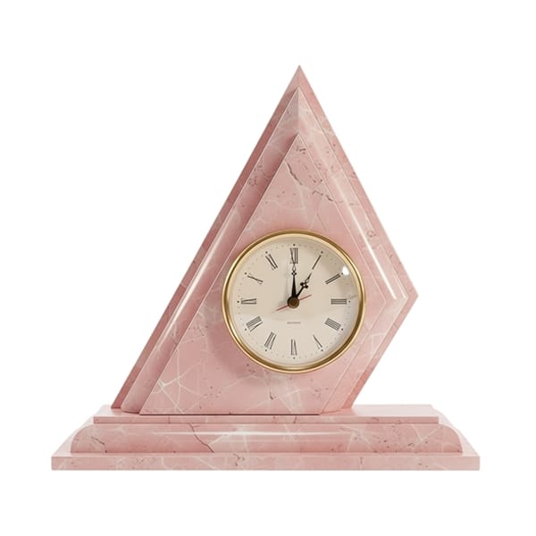 Reloj triángulo realizado en mármol rosa con acabado en brillo.